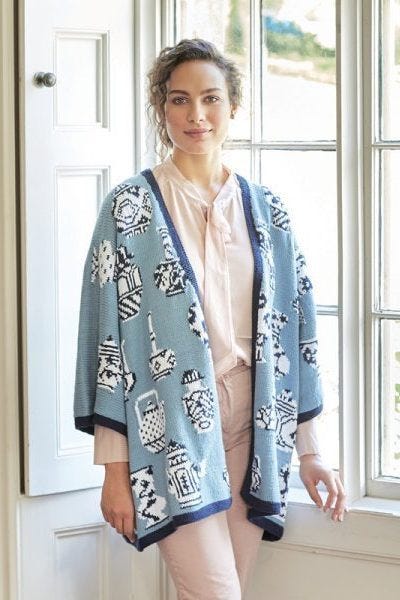 The designs in the Kaffe Fassett studio book I got are not particularly kitschy, but a lot of the patterns designed by Fassett himself are more over the top. He’s known for his bright color palette and bold motifs. I really like this cardigan, “Porcelain,” which was published in Rowan Magazine 63, and this wacky fruit and vegetable needlepoint chair. A lot of his designs are more geometric and less kitschy.