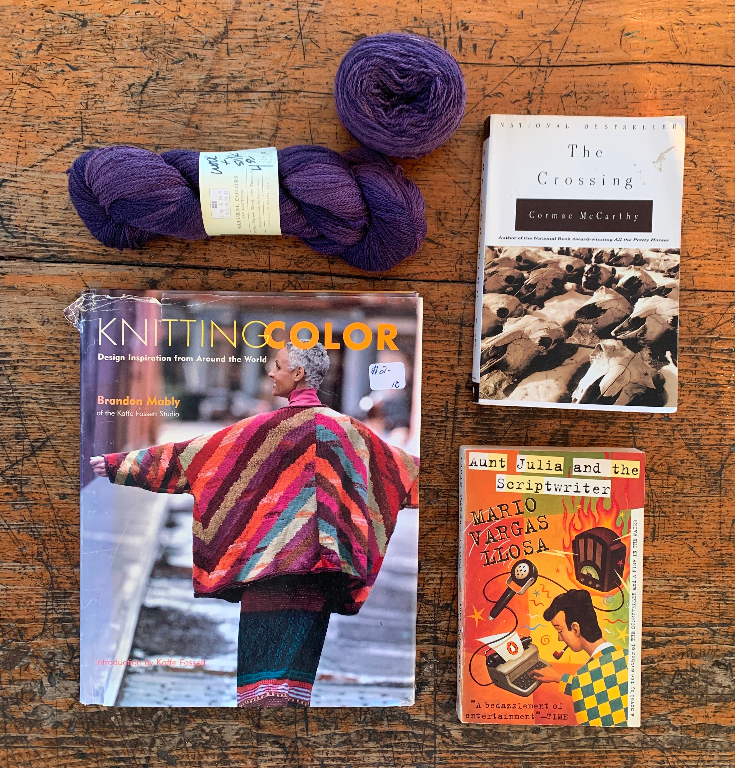 My mom and I went to the thrift store on Saturday, mostly just so I could get out of the house. They were having an incredible sale on books, so I picked up Aunt Julia and the Scriptwriter by Mario Vargas Llosa, The Crossing by Cormac McCarthy, and Knitting Color by Brandon Mably from the Kaffe Fassett studio for a quarter each. These were all pretty random, but they were a quarter! I really need to start reading my way through my physical TBR soon.